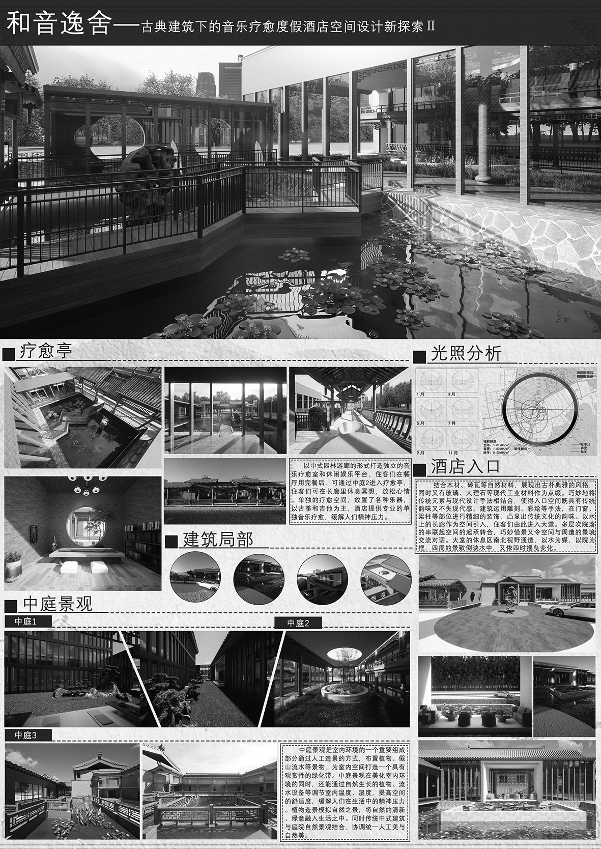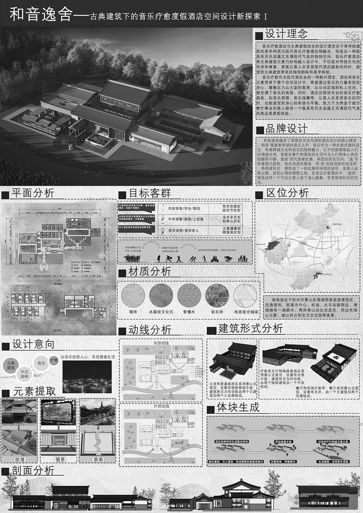 这个奖项不仅是对作者的肯定,更是对整个空间设计行业的一种激励。它为未来的空间设计提供了新的思路和方向,让更多的设计师认识到,空间设计不仅仅是对空间的简单划分和装饰,更是对人们生活方式和情感需求的深刻理解和满足。设计之魂 创意之源《音乐疗愈酒店空间设计》的独特之处在于将中国传统音乐与酒店空间进行了完美融合,成功打造出独特的疗愈主题。在这个作品中,设计师深入挖掘中国传统音乐的精髓,如传统乐器的音色、旋律以及其所传达的情感和文化内涵。同时,结合现代酒店空间的设计理念和功能需求,创造出一个既具有深厚文化底蕴,又充满现代舒适感的睡眠空间。